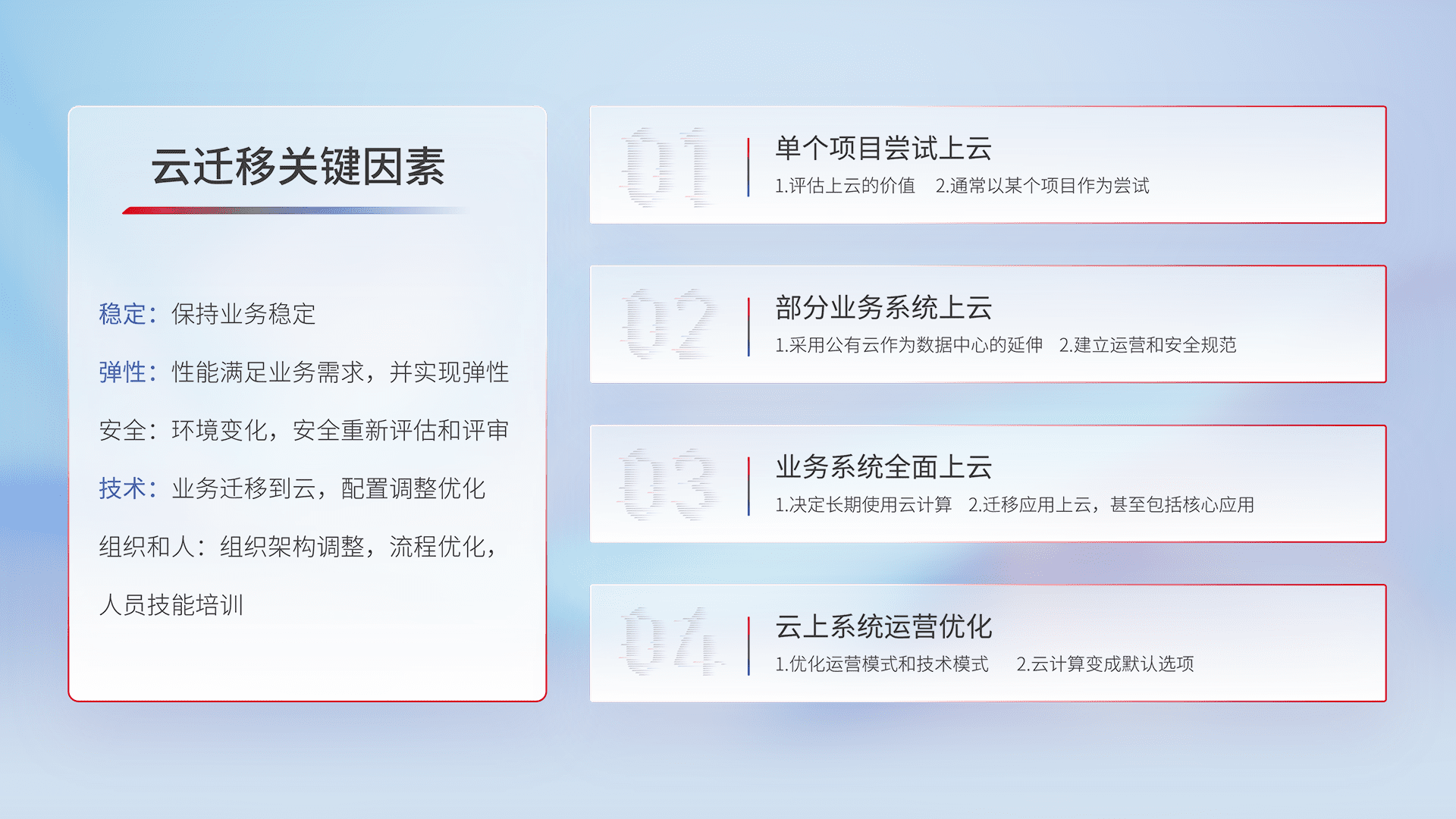 结合实际业务,,,,从规划设计、、、、云平台选型、、云原生改造、、、数据迁移、、集成交付,,,,迁移全过程为客户识别最佳上云路径,,,,做好风险识别管理,,,设计网络架构、、身份权限、、、、安全审计合规、、、、操作审计、、日志审计、、、、监控告警策略、、、、多站点容灾设计等,,,,对云上基础设施进行整体规划,,提升IT治理水平,,,以满足弹性、、、高可用、、高性能的需求。。。